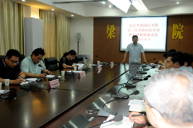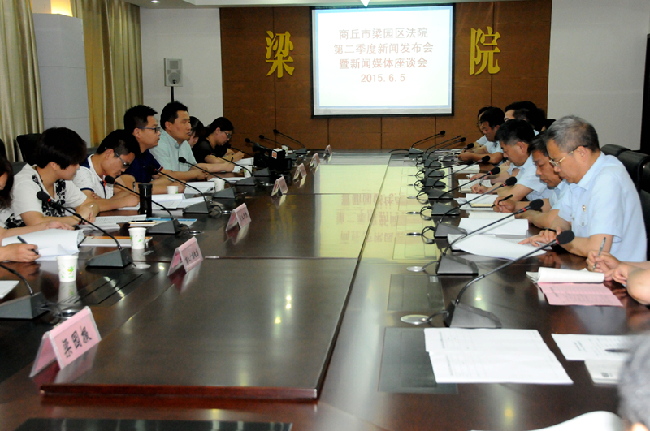 6月5日下午,河南省商丘市梁园区人民法院召开2015年第二季度新闻发布会,通过新闻媒体向社会通报1至5月份审判工作情况,还就媒体和群众关心的立案登记、执行难、投资担保等热点问题现场进行解答,驻商丘的河南法制报、东方今报和商丘日报、京九晚报、商丘电视台、商丘广播电台、梁园报等7家媒体10名记者参加了发布会。随后,还就法院新闻发布制度和联系新闻媒体制度进行了座谈和交流。