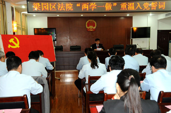 梁园区法院依据“学党章党规、学系列讲话,做合格党员”学习教育活动要求,在“五一”假期后第一个工作日,就组织全院干警进行了庄严的升国旗仪式,随后,组织党员干警面对党旗重温入党誓词,在系统学习教育活动实施方案的基层上,就扎实开展活动进行了研究和部署。