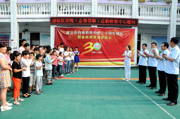在梁园区特殊教育中心,多名聋哑儿童正在院内游戏,要过节了,儿童们看起来心情都特别高兴。梁园区法院政治处主任杜建华首先向老师和儿童们致以节日的问候;教育中心负责人何校长担任同声翻译,向儿童们转达了法院干警的问候。随后,数十名无法回家团圆的儿童和教职员工与法官们合影留念。
