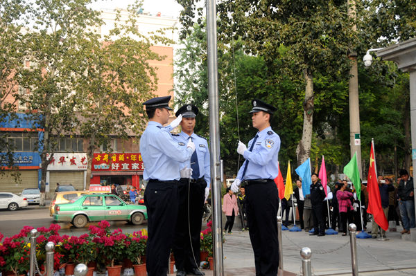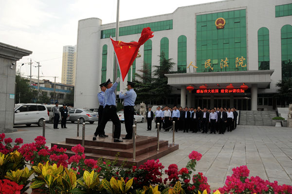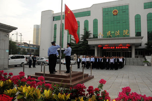 10月8日,河南省商丘市梁园区人民法院组织庄严的升国旗仪式,干警整齐列队,升旗手步伐有力,在庄严的国歌声中,伫目五星红旗冉冉升起,引得过往行人驻足观看。