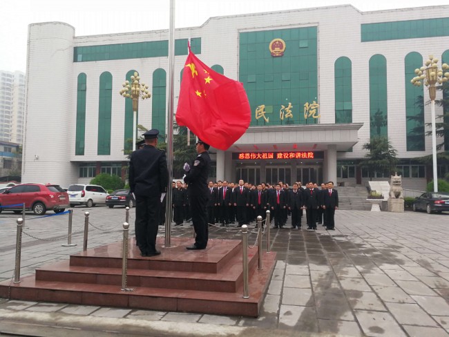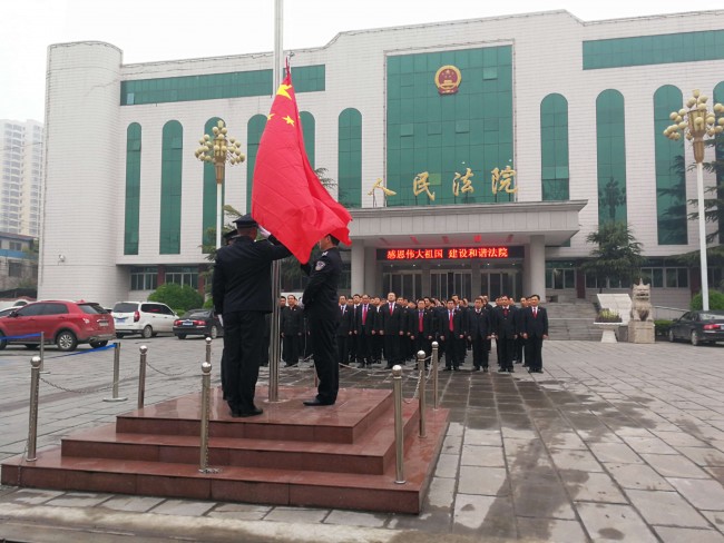 7时50分,干警们整齐着装,列队集合,3名法警担任的升旗手正步走上国旗台,随着手臂挥舞,五星红旗顺势展开,随着义勇军进行曲冉冉升上空中,迎风飘洒出鲜艳的色彩,红色代表着革命先烈的牺牲与奉献,黄色寓意当今的中国屹立在世界的东方。连续坚持多年的升国旗仪式,每当国旗升起的哪一刻,都会激励干警热血沸腾,更会让同志们齐心协力共同努力。