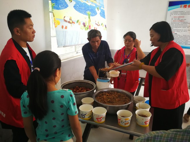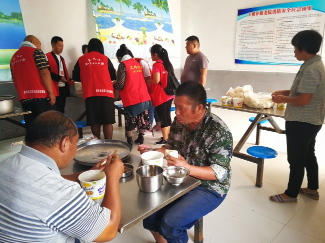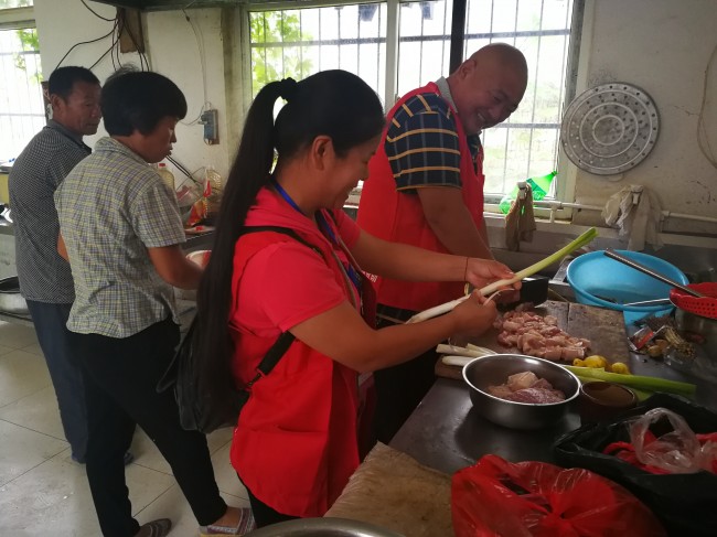 王楼乡厅堂楼敬老院地理位置偏僻,没有专人带领很难找到准确位置,但义工团成员对这里却很熟悉,和居住在敬老院的15位老人都相互认识了。义工的车辆开到院里时,多数老人都迎上来与义工亲切地找招呼。卸车之后,义工们把随车带来的专用洗脚盆摆好,每个盆里加上敬老院提前烧好的热水,先请老人们用热水泡个脚。其他义工七手八脚把带来的肉、鸡、、餐具、油等拿到厨房,洗的洗,切的切,不一会儿就做好了做饭的准备。义工大厨也开始点火做饭,时隔不久厨房里就传出了红烧肉的香味。