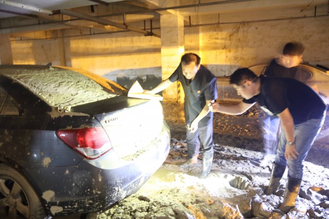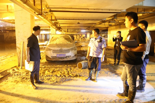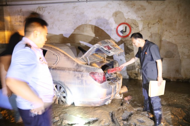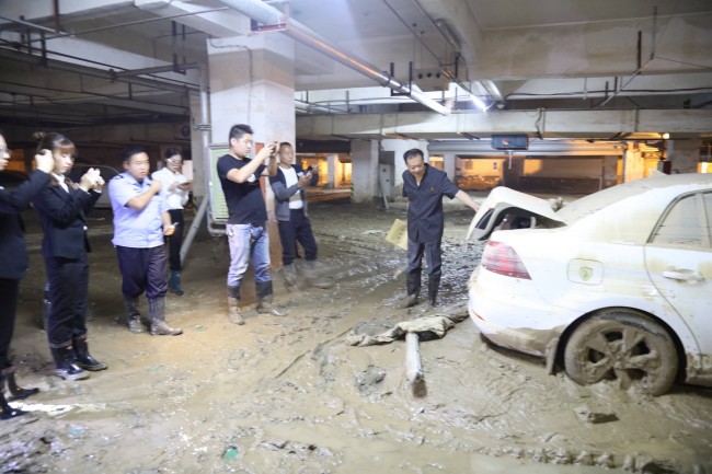 工作人员到达地下二层后,看到的情景确实让人震惊,就连车顶上的泥土就有1寸多厚,多数车门已经无法打开。为了仔细清点车内物品的数量,工作人员涉水踏泥,想法把车门打开,拍照、登记、检验,并现场勘验造成损失的具体原因。