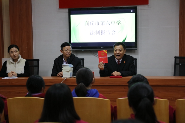 12月3日下午,法院少年庭庭长华兵应辖区第六中学之邀,冒雨驱车前往六中开展普法讲座。华兵结合中学生的年龄特点,首先以提问的方式,从宪法作为国家的根本大法,是法律体系的核心开始讲起,把专业的法律知识与校园法治实践相结合,引导中学生在学习、生活中,如何学法、懂法,并学会运用法律保护自己,如何避免校园伤害提出了建议及方法。最后,华兵向40余名学生代表赠送了《让法律照亮留守儿童回家的路》漫画书和《中华人民共和国宪法》,希望他们能从书中受益。辅导让师生增强了法律意识、宪法意识和安全防范意识,同学们听得认真,记得仔细,辅导活动取得了良好的效果。