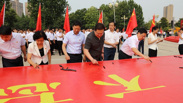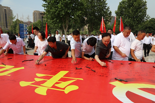 在中国共产党成立98周年节日之际,梁园区组织庄严的“党日活动”,以特有的形式向党和人民表初心,进一步提升组织纪律观念和为人民服务意识。活动现场,6名几十年党龄的老党员为新党员配戴党徽,并带头向党表初心,万余名党员共同举起右手,重温入党誓词。随后,党员们走到签名台前,写下了对党要说的一句话,并签上了自己的姓名,活动进一步激发了全体党员为人民服务的热情。