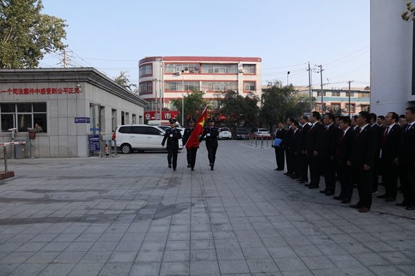 上午8时整,3名升旗手精神抖擞,迈着矫健的步伐走上升旗台,伴随着庄严的乐曲,全院干警齐声高唱国歌,五星红旗冉冉升起,全体干警整齐列队,向国旗行注目礼,五星红旗迎风飘扬,雄壮的国歌振奋人心。