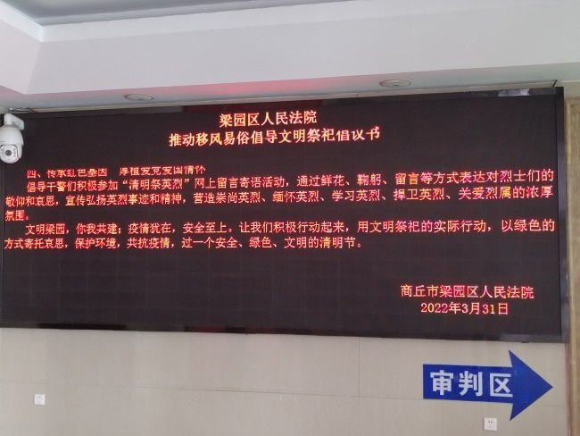 清明节是中华民族缅怀英烈、悼念先人、寄托哀思、传承文化的传统节日。当下,新冠疫情也正在各地连续传播,为了避免清明节因人员聚集引发病毒传播和交叉感染,营造安全、有序、文明、和谐的良好祭扫氛围,3月31日,河南省商丘市梁园区人民法院向全院干警发出倡仪书,大力倡导干警通过网上祭祀、鲜花祭祀、留言祭祀等形式,积极参加“清明祭英烈”活动,通过鲜花、留言等方式,表达对烈士们的敬仰和哀思,降低实地祭扫人员聚集交叉感染的风险。