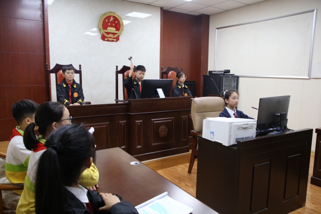 为更好的开展法治教育,在学校老师和法官的共同指导下,由学生扮演法官、公诉人、辩护人、法警、被告人的模拟法庭,现场“开庭”审理了一起学生打架案件。特殊的法治教育形式,不仅引起了孩子们学习法律的兴趣,还让他们从心灵上认识了法庭,知道了学习法律的重要作用。