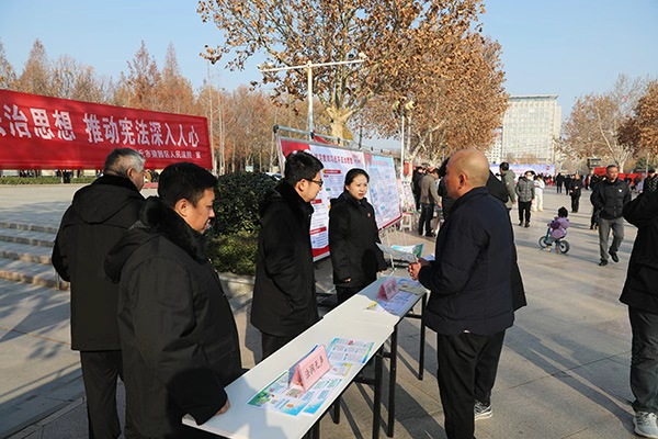 三块主题鲜明的展板,则系统展示了从习近平法治思想到“八五”普法成果的法治建设画卷。活动现场的热烈氛围和扎实内容,吸引了前来视察的市人大常委会副主任、区委书记张团结等领导的目光。领导们在梁园区法院展台前驻足良久,仔细翻阅各类宣传品,并听取现场介绍,对于梁园区法院紧扣“宪法宣传周”与“八五”普法收官之年的双重主题,给予了高度评价:这种既突出思想高度又贴近民生需求的宣传做法,真正体现了对普法工作的用心、用情。