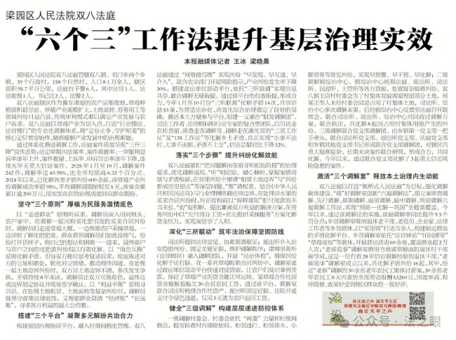 构建基层治理协同平台,融入村级网格化管理。双八法庭通过“网格微信群”实现纠纷“早发现、早互通、早介入”,联合农业部门开展风险提示,产业纠纷发生率下降30%。搭建政法单位联动平台,依托“三所联调”实现信息共享、联合调解无缝衔接。通过该平台的有效衔接,形成合力,今年1月至10月“三所联调”化解矛盾14次,共享信息53条,为营造法治化、高效化综合治理奠定了良好的基础。激活本土力量参与平台,组建一支融合“银发调解团”、司法工作者、法律顾问和行业专家的复合型团队,以信访走在排查前、排查走在调解前、调解走在激化前的“三前工作法”及“135工作法”等化解乡土矛盾,真正实现“小事不出村、大事不出镇、矛盾不上交”,信访总量同比下降32%。