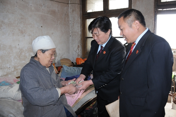 每年的10月份,都是77岁残疾老人郭秀兰生活补助费给付的日子。17日上午,执行干警郭爱勤和其他同志一起再次来到老人的家中。来到病床前,郭秀兰老人就亲切地拉住郭爱勤的手不放,还一遍又一遍地说:闺女,碰上你这样的好法官真是我的福气,你真比亲闺女还要亲。