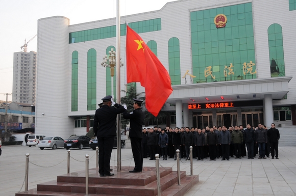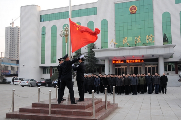 2013年1月4日,河南省商丘市梁园区法院全体干警迎着初升的太阳,组织庄严的升国旗仪式,决心乘着十八大春风,以崭新面貌迎接新年度的新挑战,用实际行动践行“忠诚、为民、公正、廉洁”的政法干警核心价值观。