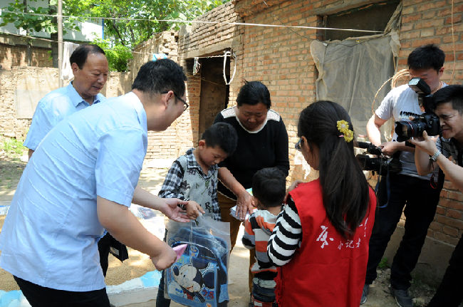 在留守儿童许艺篷家,小记者邓茗心和妈妈一起,首先向许艺篷赠送了书包、文具、笔记本和《留守儿童普法宝典》,邓茗心还将自己亲手绘制的一幅漫画送给许艺篷,与许艺篷亲切交流,小伙伴们还七手八脚帮忙晒麦子,场景十分感人,看到家中放着的犁具,小朋友们还模仿着学起犁地来。
